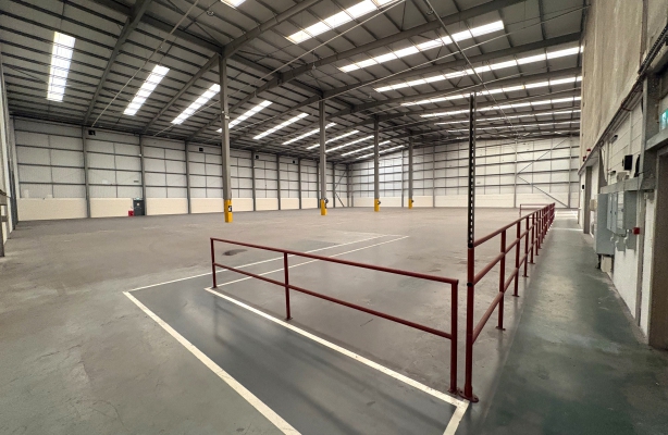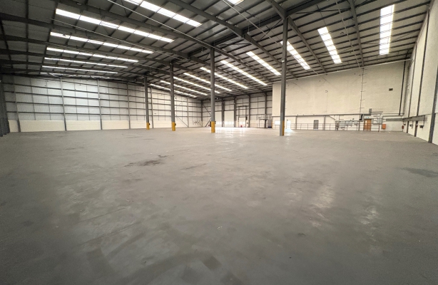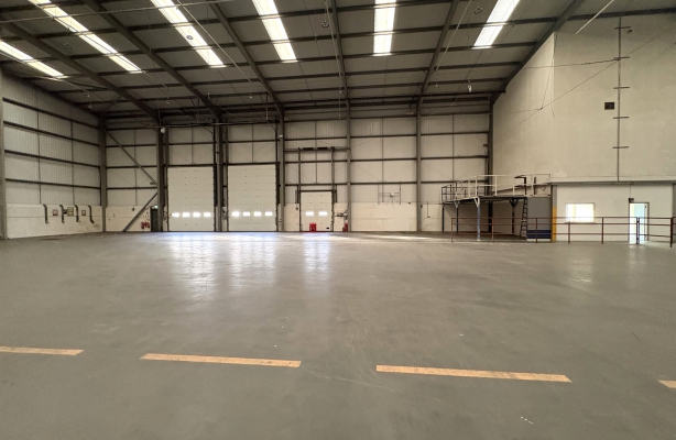 The warehouse has a minimum internal height clearance (to underside of portal haunch) of 10m, having concrete ground floor slab with designed UDL of 50kN per square metre (1,000 per square foot). It is fitted in part with suspended sodium lamps and incorporates ground floor WC facilities, reception area, canteen and a production office.